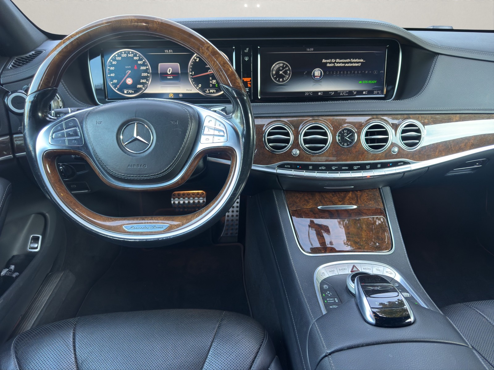 Das Interieur der S-Klasse ist in Schwarz gehalten, und die Armaturentafel des Cockpits ist mit edlem Wurzelholz ausgestattet. Ein selterne Wagen, der auf der Straße alle Blicke auf sich zieht.